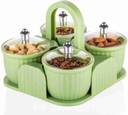 Multipurpose 4 Jar Dryfruit Set / Candy, Chocolate, Snacks Storage Jar, Masala Jar Set for Home and Kitchen (Color: Pista) Introducing our Marvella Plastic Multipurpose Dry Fruit Set, the perfect addition to your kitchen or dining space for stylishly storing and serving your favorite dry fruits, nuts, and snacks. Crafted from durable, high-quality plastic, this set is designed to meet all your dry fruit storage and serving needs. Key Features : Multi-Compartment Design : This dry fruit set features multiple compartments, each with its own lid, allowing you to organize and store a variety of dry fruits and snacks separately. Say goodbye to mixing flavors and enjoy the freshness of each treat. Transparent Containers : The transparent plastic containers allow you to easily identify the contents inside, making it convenient to find and access your favorite snacks. Stylish and Practical : The sleek and modern design of this dry fruit set adds a touch of elegance to your dining table or kitchen. It's not only functional but also a beautiful serving option for when you have guests over. Easy to Clean : The plastic material is easy to clean and maintain, ensuring that your dry fruit set looks as good as new even after repeated use. Multipurpose Use : While primarily designed for dry fruits, this set can also be used to store a wide range of snacks, such as candies, chocolates, small cookies, and more. Durable Construction : Made from high-quality, food-grade plastic, this set is built to withstand daily us