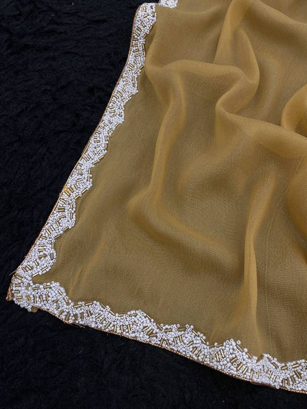 LACEMOTI-Gerogette Simmer Fabric Full Solid\ Plain With Small Moti Lace Side Border New Trending Saree