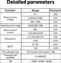VDC Voltage Accuracy±3%DC Current (Amp)50µA-10 ADC Current, ADC Current Accuracy±3%Resistance (Ohm)0.2 ?-20, M?Resistance Accuracy±3%hFE ( TR Amplification factor)0-1000