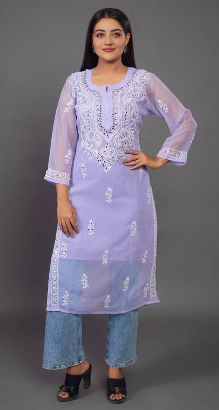Our women's kurti is the perfect blend of comfort and style, designed to elevate your ethnic wardrobe. Made with high-quality breathable fabric, this kurti offers a comfortable fit that allows you to move freely throughout the day. Lucknowi chikankari handwork kurti mirror work elegant design and intricate detailing add a touch of sophistication to your look, making it ideal for any occasion. Pair it with your favourite leggings, palazzo pants or jeans for a versatile and trendy look. With a range of colours and sizes to choose from, our women's kurti is a must-have addition to your wardrobe. it is a pair of 1 kurti and 1 matching colour cotton inner.