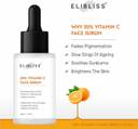 • Elibliss 20% Vitamin C Face Serum is a high-performance skincare solution designed to brighten, hydrate and protect the skin while targeting dark spots, uneven tone and signs of aging. Formulated with 20% Vitamin C, this potent antioxidant helps neutralize free radicals, boost collagen production and promote a radiant, youthful glow. The addition of Niacinamide enhances skin texture, minimizes pores and strengthens the skin barrier, while Hyaluronic Acid provides deep hydration, keeping the skin plump and supple. Ferulic Acid works synergistically with Vitamin C to enhance its stability and effectiveness, ensuring long-lasting benefits, while Aloe Vera Extract soothes and calms irritation, making the serum suitable for all skin types.