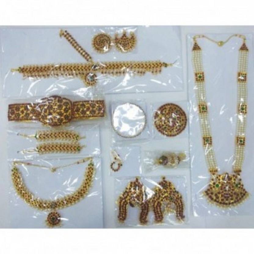 1 long neck less, 1 small neck less, 1 mangteeka, 1 pair jhumka, 1 Kamarband, 1 moon and 1 star, 1 pair bangle, Nath
