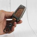 Premium Luxury Brown Metal Leather Flip Key Cover With Key chain Compatible with Toyota Innova, Innova Crysta ,Corolla Altis, Camry, Hilux (3 button Flip Key) (Brown Leather)
