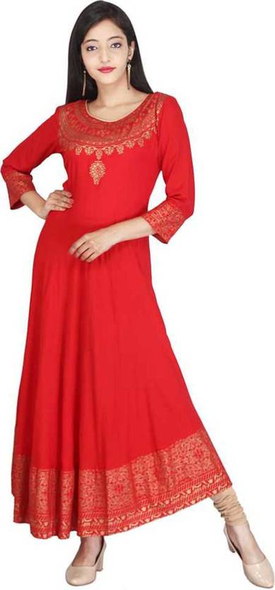 Eliza Women Printed Cotton Silk Anarkali Kurta (Red)