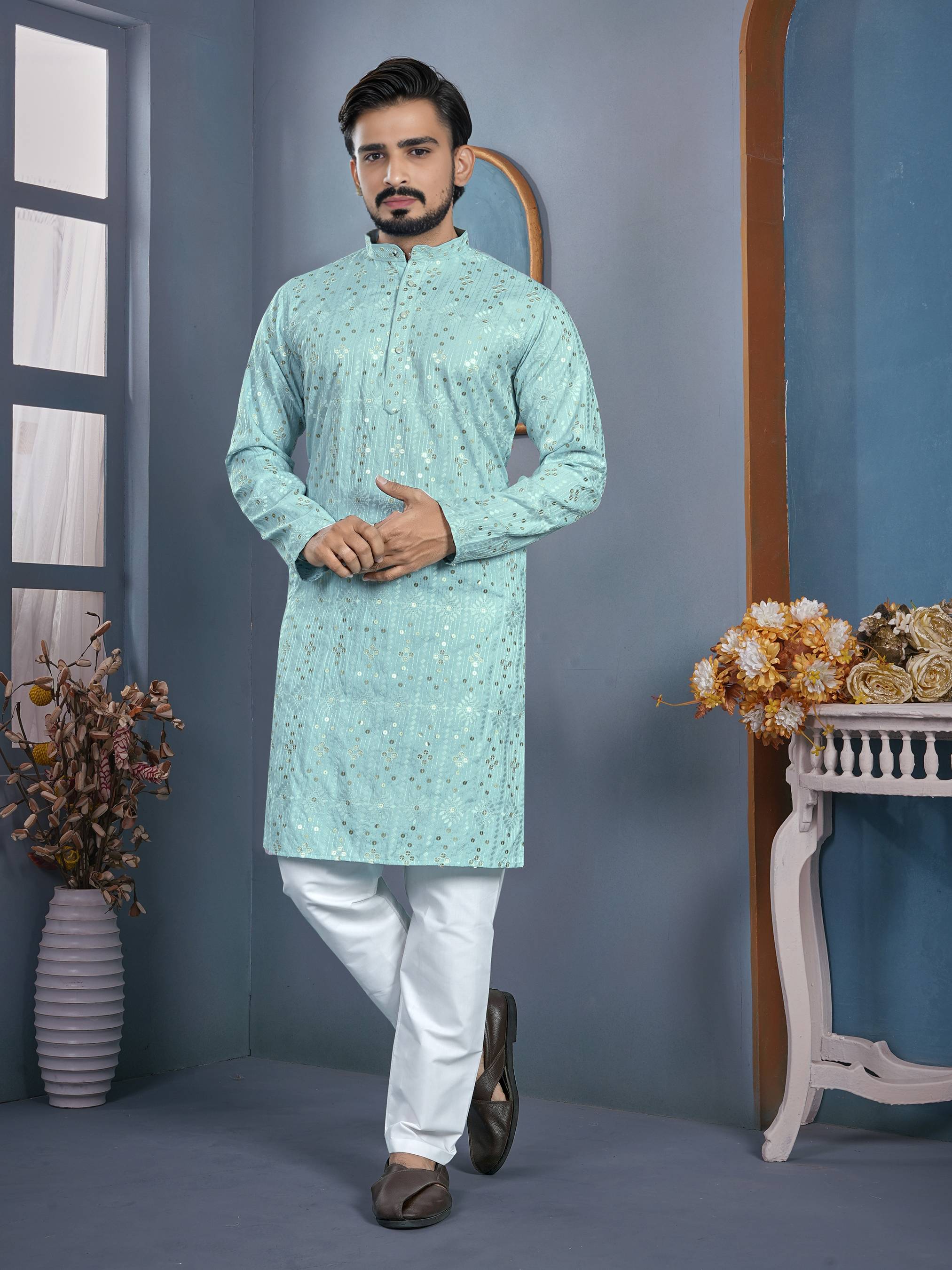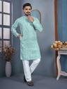 Add a touch of elegance to your festive and traditional wardrobe with this stylish men's kurta pyjama set. Crafted from premium quality fabric, this kurta features a beautiful all-over embroidered pattern with a mandarin collar and buttoned placket for a classy ethnic look. The matching pyjama ensures comfort and completes the traditional outfit. Ideal for festivals, weddings, functions, and special occasions.