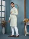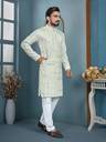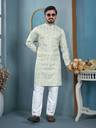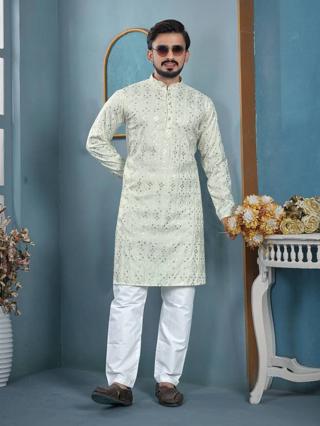 Add a touch of elegance to your festive and traditional wardrobe with this stylish men's kurta pyjama set. Crafted from premium quality fabric, this kurta features a beautiful all-over embroidered pattern with a mandarin collar and buttoned placket for a classy ethnic look. The matching pyjama ensures comfort and completes the traditional outfit. Ideal for festivals, weddings, functions, and special occasions.