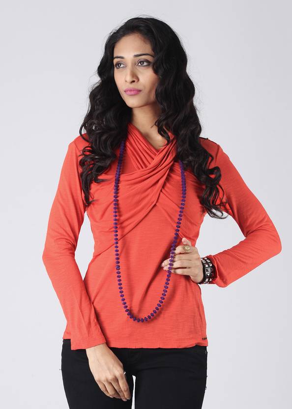 Straight from the designer’s notepad to your wardrobe! Elle’s chic orange top is just your ticket to creating a runway-worthy style. Designed with a wrap over at the front, this top goes best with muted black jeans and strappy heels.