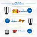 Thanks to its up to three stainless steel jars of varying capacities, this mixer-grinder can cater to a variety of cooking needs. And, the jar lids ensure the safety and security of your ingredients while grinding.