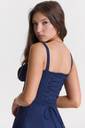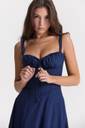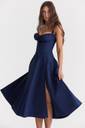 A Line Navy Bustier Sundress Corset dress in sweetheart neckline, sleeveless, solid colour, A-line, thigh slit, midi length, boning details at front and zipper closure at the back.
