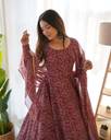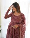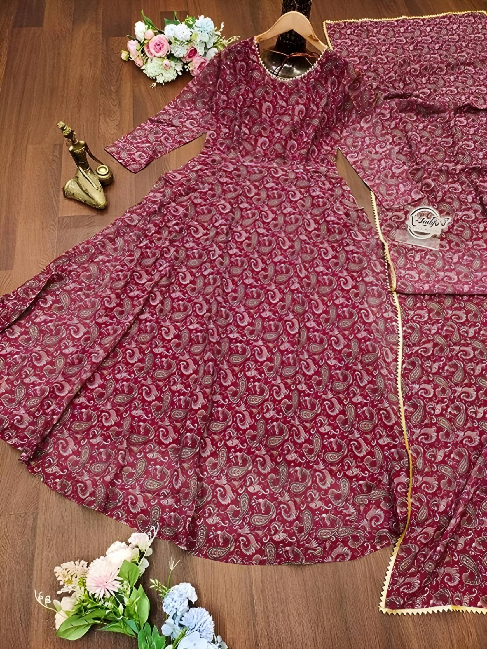 Elevate your ethnic wardrobe with this elegant georgette fabric gown set, designed to offer grace, comfort, and timeless style. Crafted in a rich wine/maroon shade, the gown features an all-over beautiful paisley print that gives it a classy and festive appeal.