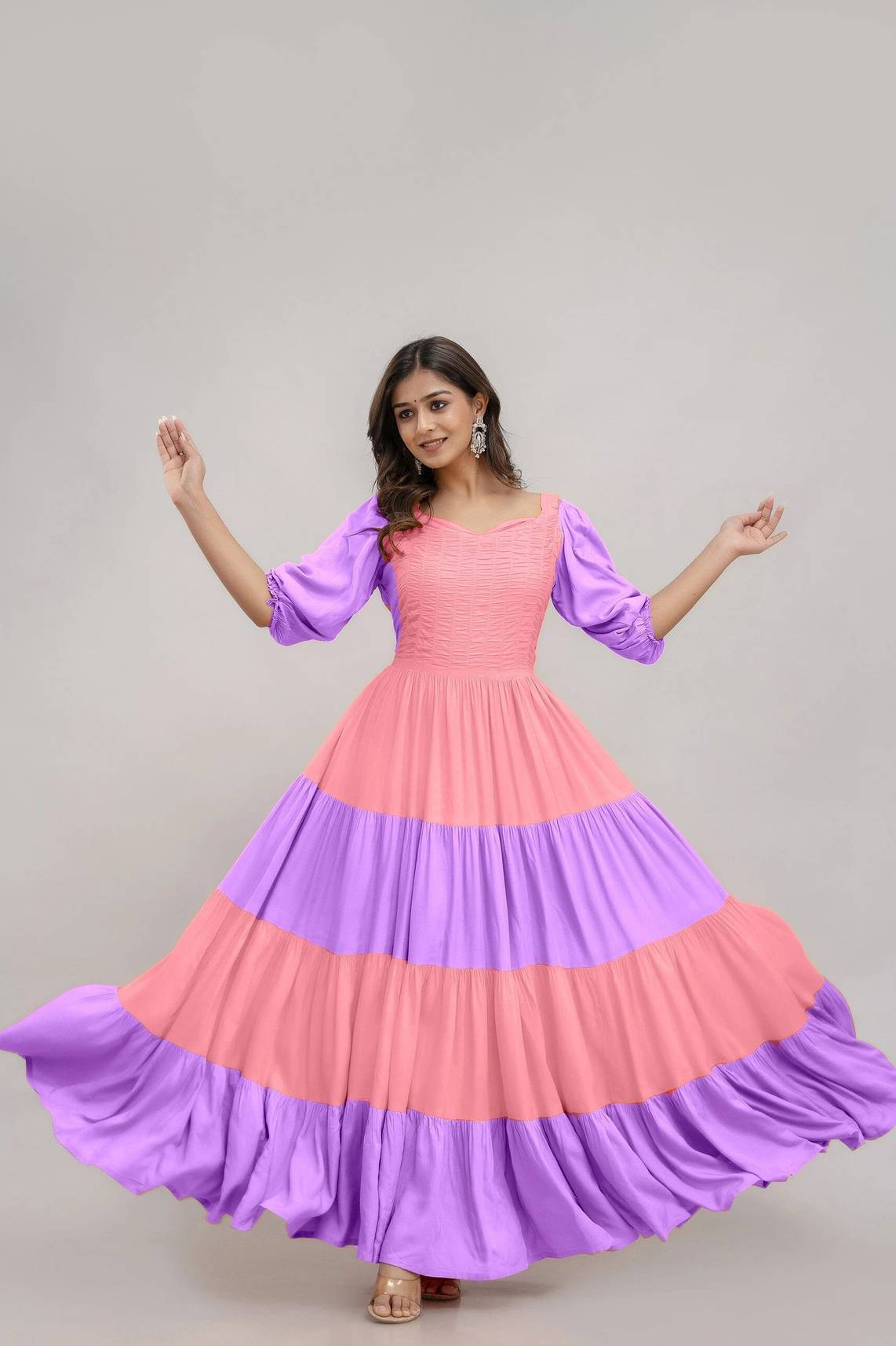 The gown comes with a soft crepe inner, ensuring a smooth feel on the skin and comfortable wear throughout the day. The flowy silhouette and flared hem enhance movement, while the round neckline and 3/4th sleeves add a touch of sophistication.