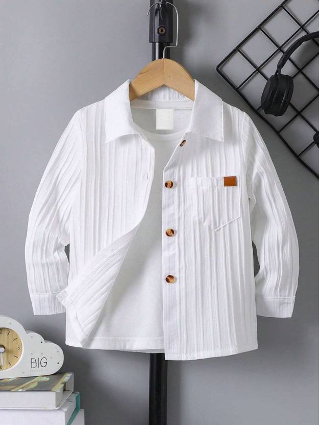 Give your little one a smart and stylish look with this premium full-sleeve white shirt Kids. Crafted from soft and breathable cotton-blend fabric, this shirt features a vertical textured pattern that adds subtle elegance to its design. The stylish wooden buttons and a single front pocket with a faux leather tag detail make it perfect for both casual outings and special occasions.