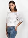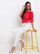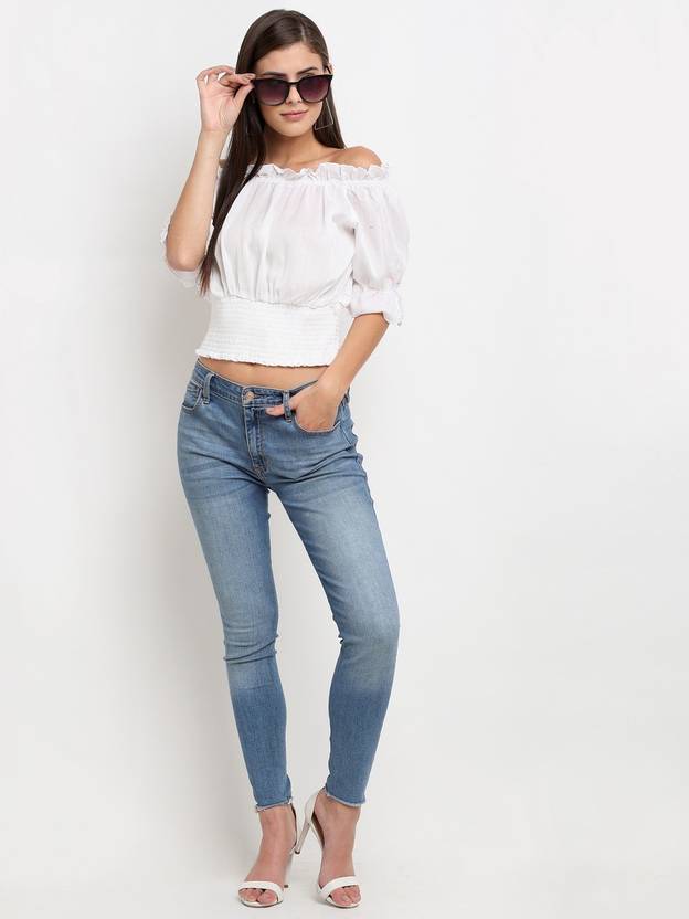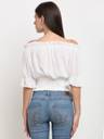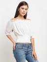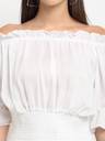 Emeros presents to you the latest fashion statement in form of this trending crop top, accompanied by smocked bodice and frill sleeves. This off-shoulder piece shall definitely be the attraction, be it any occasion! Be Beautifully Chaotic!