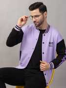Lavender & white solid lightweight varsity jacket, has a stand collar, 2 pockets ,has a snap button closure, long sleeves, straight hemline, fleece lining