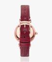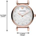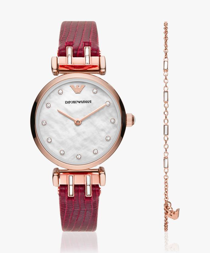 Emporio Armani's gift set includes a 28mm watch featuring a white mother-of-pearl glossy dial with glitz indexes, two-hand movement and burgundy leather strap as well as a rose gold stainless steel chain-link bracelet with a rose gold eagle logo charm.