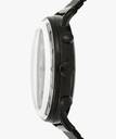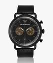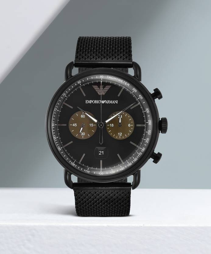 The mesmerizing black-brown sunray dial along with a mesh bracelet is the unique selling point of the Aviator chronograph watch by Emporio Armani for men and has many eyeing it right now. The dial has neatly arranged white lum hand movements that are uncluttered and easy to look at and grey dash markings at all hour, two subdials, a date window and three crowns to its side. The entire piece along with the dial, black mesh bracelet and case is resistant, sturdy and durable.