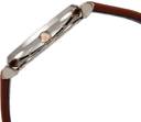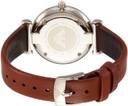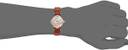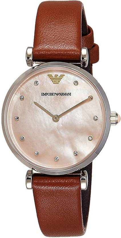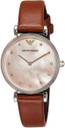 Gold-tone stainless steel case with a brown leather strap. Fixed gold-tone bezel. Pink mother of pearl dial with gold-tone hands and crystal hour markers. The Emporio Armani logo appears on the 12 o'clock position. Dial Type: Analog. Quartz movement. Scratch resistant mineral crystal. Pull / push crown. Solid case back. Case size: 28 mm. Case thickness: 7 mm. Round case shape. Band width: 14 mm. Tang clasp. Water resistant at 30 meters / 100 feet. Functions: hour, minute. Dress watch style. Armani Retro Pink Mother of Pearl Dial Ladies Watch AR1960.