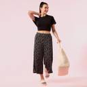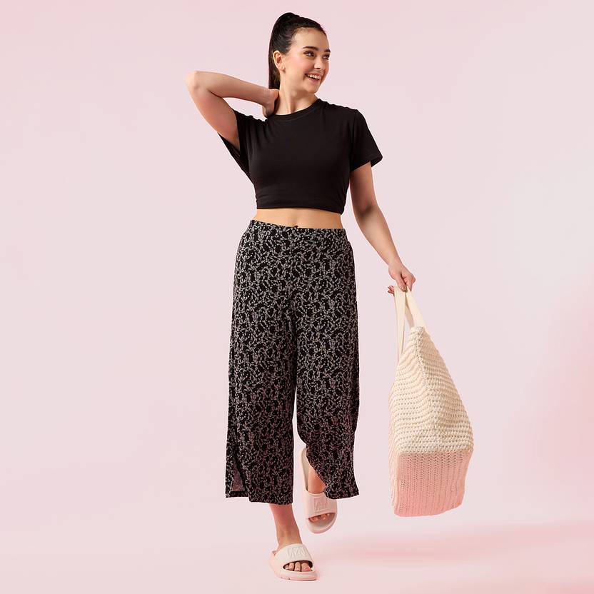 Fabric: Super soft & drapey viscose stretch jersey fabric. | Fit: Relaxed Fit | Mid Rise | Crop Length. Designed to lounge in all day feeling relaxed. | Soft elasticated back waistband with flat front for a smooth non bulky fit at the waist. Stylish side slit at the leg opening helps to move freely and feel cool & comfortable in summer. Comes with one invisible zipper functional pocket. Machine wash gentle cycle with like colors | Do not bleach | Do not wring & flat dry | Do not tumble dry | Do not iron on print | Low iron