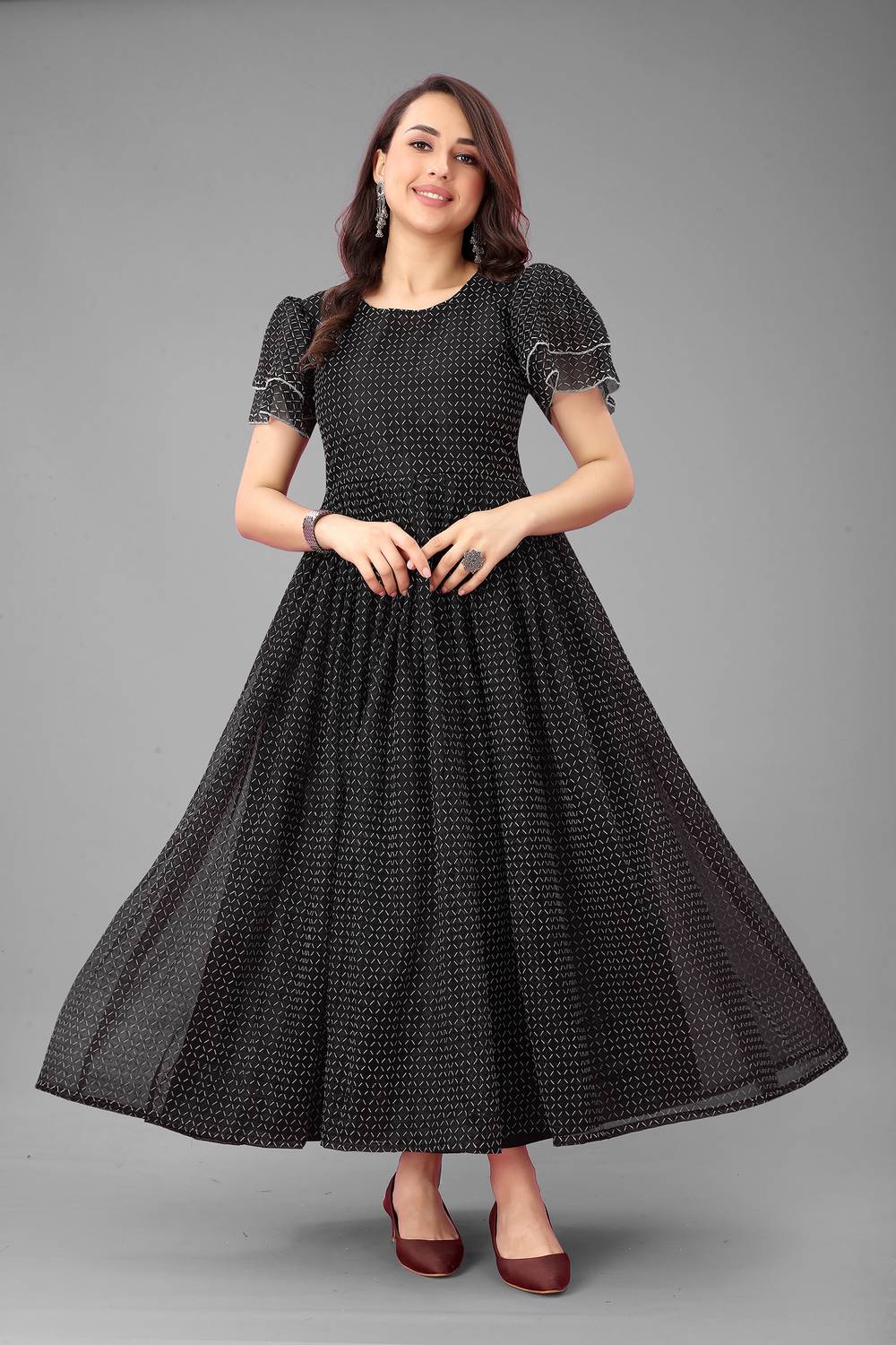 Gown Fabric : Net and Satin Silk, Gown Color : Black , Gown Neck Style : Round Neck, Gown Work : Embellished, Size Guide : Free Size Fits Upto bust 44 Inch, Gown Sleeves Style: Sleeveless, Occasion : Party Wear,Wedding wear, Festival Wear, Stitching Type : Semi-Stitched, Season Type : Suitable For All Season
