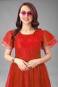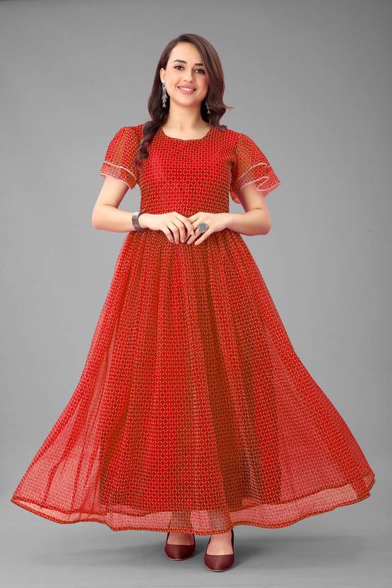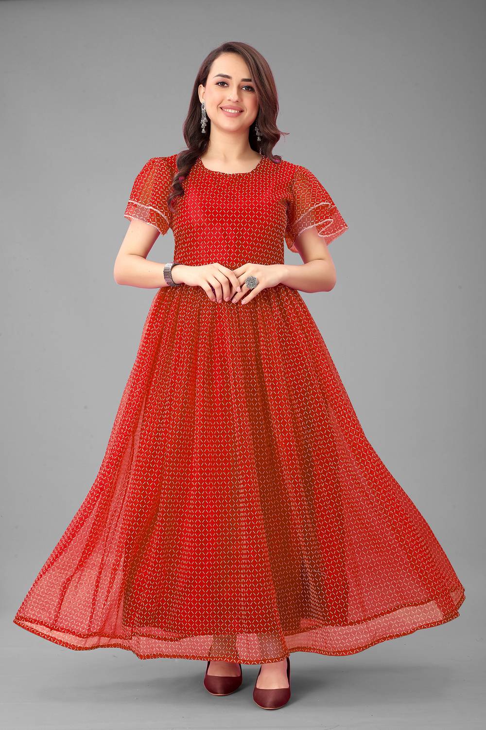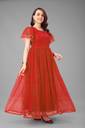Gown Fabric : Net and Satin Silk, Gown Color : Red , Gown Neck Style : Round Neck, Gown Work : Embellished, Size Guide : Free Size Fits Upto bust 44 Inch, Gown Sleeves Style: Sleeveless, Occasion : Party Wear,Wedding wear, Festival Wear, Stitching Type : Semi-Stitched, Season Type : Suitable For All Season