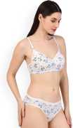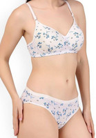Presenting a matched combination of a bra and a pair of panties, this women’s lingerie set features an all-over floral pattern. The petite, evenly arranged blossoms create a soft and feminine visual appeal. In addition, the fine print appears well-balanced and orderly, adding a subtle charm to the overall look. The panties reflect the same floral motif, ensuring consistent detailing and a smooth, coordinated silhouette throughout the set.