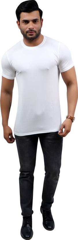 Men Solid Round Neck Cotton Blend White T-Shirt