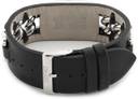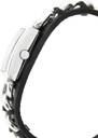 The iconic rectangular dial has two metallic time display hands and clear stones that act as the main time markers which add that necessary bling to the heavy metal inspired watch. However, the strap of the watch is the real highlight. The chain-like metal strap is sewn onto a cuff that adds to the appeal of this trendy watch.