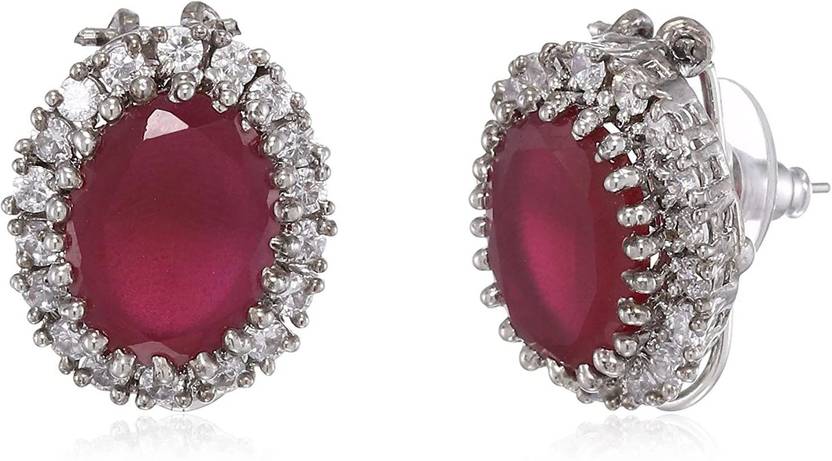 Estele Rhodium Plated American Diamond CZ Ruby Halo Stud Earrings Brass Stud Earring