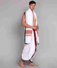 Courtesy of its versatile appeal, this dhoti and angavastram set is suitable for weddings,...