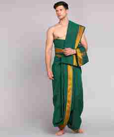 Thanks to its versatile design, this men’s dhoti and angavastram set can be styled for var...