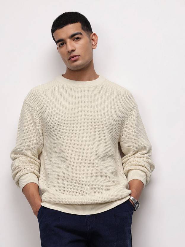 ether Solid Round Neck Casual Men White Sweater
