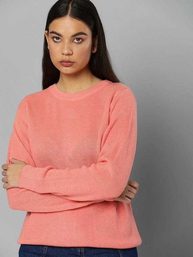 ether Solid Round Neck Casual Women Pink Sweater