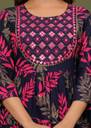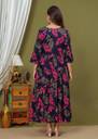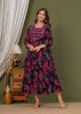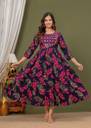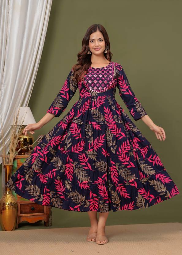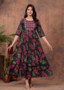 The gown features a round neckline with beautifully printed yoke, 3/4th sleeves, and a tiered flared Anarkali-style pattern that enhances the overall flow and fall of the dress. Its long length and flared silhouette make it perfect for daily wear, festive occasions, casual outings, office wear, and family gatherings.
