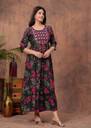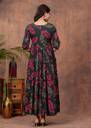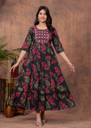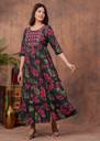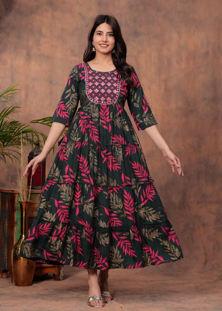 The gown features a round neckline with beautifully printed yoke, 3/4th sleeves, and a tiered flared Anarkali-style pattern that enhances the overall flow and fall of the dress. Its long length and flared silhouette make it perfect for daily wear, festive occasions, casual outings, office wear, and family gatherings.