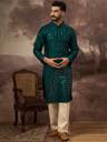 Ethnic Bay Men Teal Silk Blend Solid Embroidered Straight Kurta