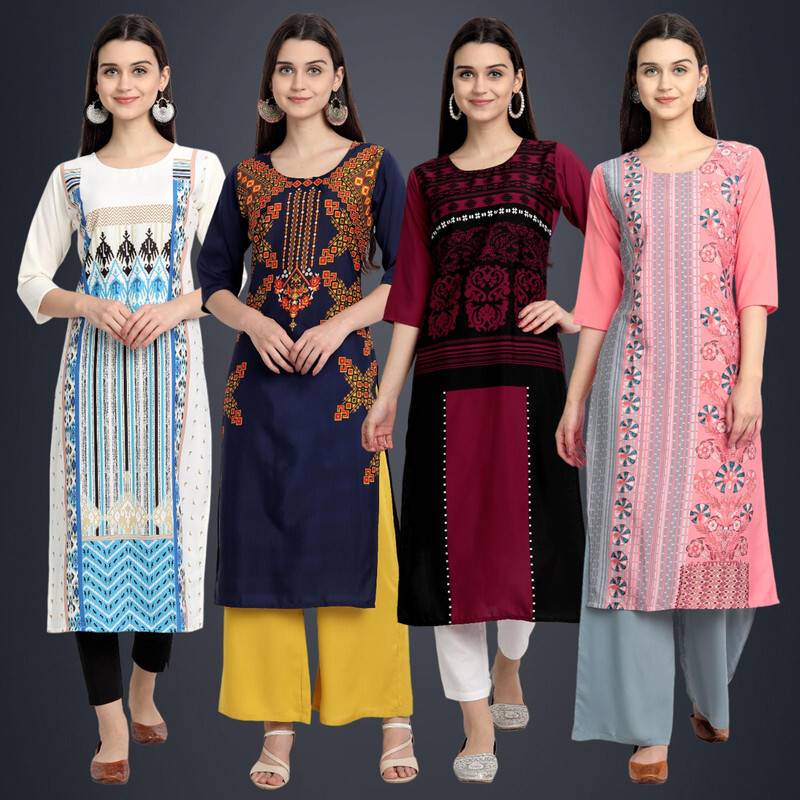 Pack of 4 Women Printed Crepe Straight Kurta (Multicolor)