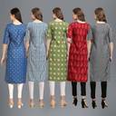 Round-neckline and ¾ length sleeves for a relaxed fit. Features contrast print, lightweight kurta woven in a soft and premium crepe fabric for everyday wear,Classic colour with beautiful Ethnic Motif print .Straight fit cut with side slits and panels render a stylish print. Size- S, M, L, XL, XXL.
