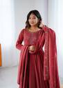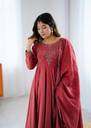 Discover our stunning maroon Anarkali dress, perfect for weddings, festivals, and parties. This elegant Indian gown features intricate silver embroidery, a flowing silhouette, and a flattering fit. Made with high-quality fabric, this traditional Anarkali suit offers both comfort and style. Shop now for the latest in ethnic wear and make a statement at your next event