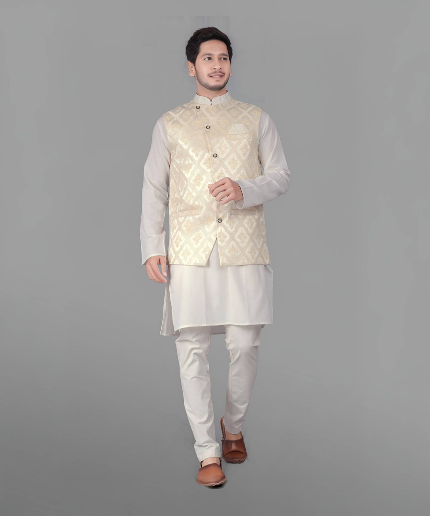 Try a desi Mens look with this timeless men’s kurta Set With Jacket . The pure cotton fabric With attain these bright coloured Names all over. The rest of the outfit features a mandarin collar, a placket and full sleeves with a straight hemline. Invest in this for the upcoming festive season