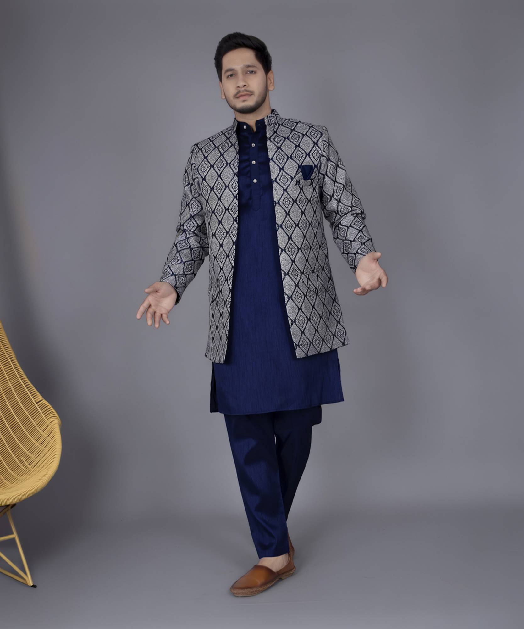 Ethzy Brings you quality and affordability. We take pride in our commitment to maintain quality standards in each Piece Manufactured by us. A true epitome of class, this designer Sherwani Combo will surely reflect your impeccable taste in Fashion. Made from Heavy Jacquard Fabric this set will surely make you the cynosure of all eyes. Team this Sherwani with a pair of Mojris or Kolhapuri Chappals to give a classy touch to your ethnic look.