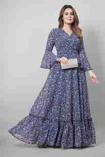 Floral Print Georgette Stitched Flared/A-line Gown (Dark Blue)