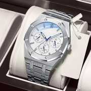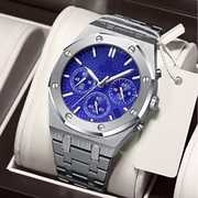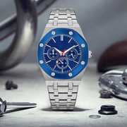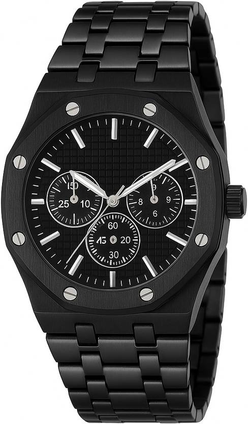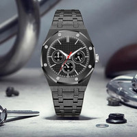 This wristwatch features a classic analogue design, with a main hour, minute, and second (HMS) dial complemented by three subdials for additional functions. The analogue display provides a timeless and traditional look, allowing users to easily read the time at a glance. The inclusion of subdials adds functionality along with a rugged look. This classic analogue watch design appeals to those who prefer a traditional and elegant aesthetic in their timepieces.