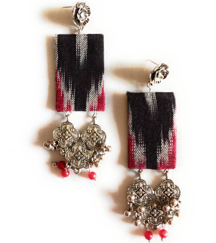 Handcrafted German Silver Oxidised Ikat Fabric Black Red Earrings