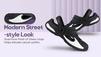 Sporting a dual-tone finish, these clogs bring a refined, modern look to everyday footwear. The contrast pattern adds visual appeal without being overly bold, complementing casual wear with effortless ease. The sleek lines and minimalistic structure make them versatile enough for indoor relaxation or outdoor errands. This tasteful design ensures they pair well with various outfits, blending comfort with subtle style.
