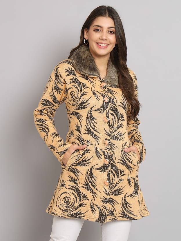 eWools Printed Collared Neck Casual Women Beige Sweater
