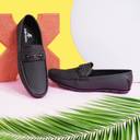 These men's loafers feature a stylish textured upper and a distinctive metal embellishment on the vamp, offering a blend of casual comfort and sophisticated style. Designed as a slip-on, they provide ease of wear without compromising on elegance. The durable PVC sole ensures good grip and comfort for everyday use. Perfect for pairing with casual trousers, jeans, chinos, or even shorts, these loafers are versatile enough for various occasions, from daily outings to semi-formal gatherings.