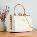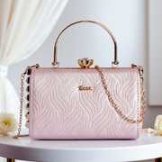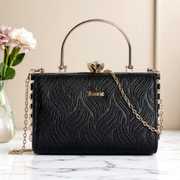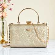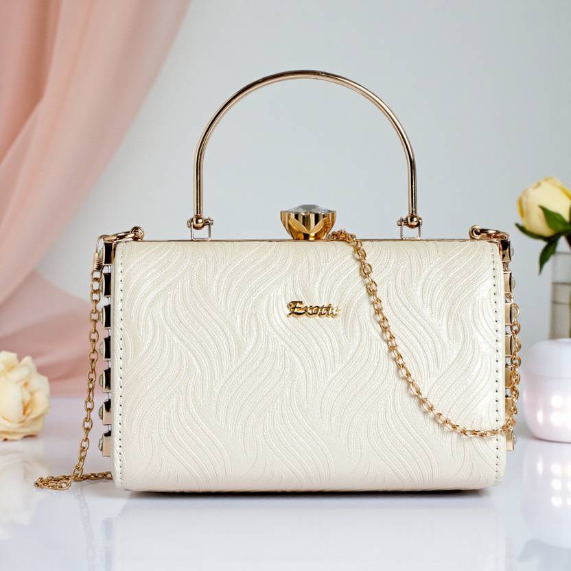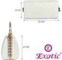 The bag exudes an aesthetic and luxurious appeal with its elegant gold handle and matching gold chain strap, complemented by eye-catching gold and crystal embellishments on the sides that add a touch of glamour. The brand name “Exotic Premium” is prominently displayed in gold lettering on the front, enhancing its premium look. While the exact material is difficult to identify, the bag's overall design reflects sophistication and charm. It also features one inner pocket for added convenience, making it not only stylish but also functional for everyday use or special occasions. With its stunning design and practical features, this bag also makes for a perfect gift option for birthdays, anniversaries, or festive celebrations.