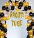 Design: GROOM TO BE letter balloons (gold), 25 black latex metallic balloons, 25 golden latex metallic balloons 25 silver latex metallic 10 golden confetti balloons