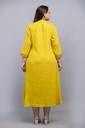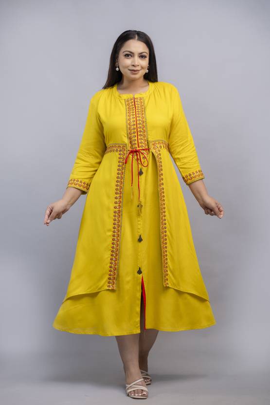 Fabric: Premium-quality soft rayon – lightweight, breathable, and comfortable for all-day wear., Pattern: Solid-colored base with intricate embroidery, featuring ethnic floral and geometric motifs along the neckline, sleeve cuffs, and front panel for a regal look., Fit Type: Flared, A-line silhouette that enhances curves while providing a comfortable and elegant drape., Neckline: Round-neck with embroidery detailing, adding sophistication to the design., Closure Type: Slip-on style with front button detailing, offering both convenience and style.