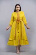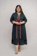 The intricate embroidery on the neckline, sleeve cuffs, and front panel adds a rich ethnic charm, while the flared hemline and front slit create a modern yet traditional look. The adjustable drawstring waist with decorative tassels provides a customized and flattering fit, enhancing your curves beautifully.